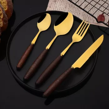 24-Piece Gold Stainless Steel Cutlery Set with Wooden Handles